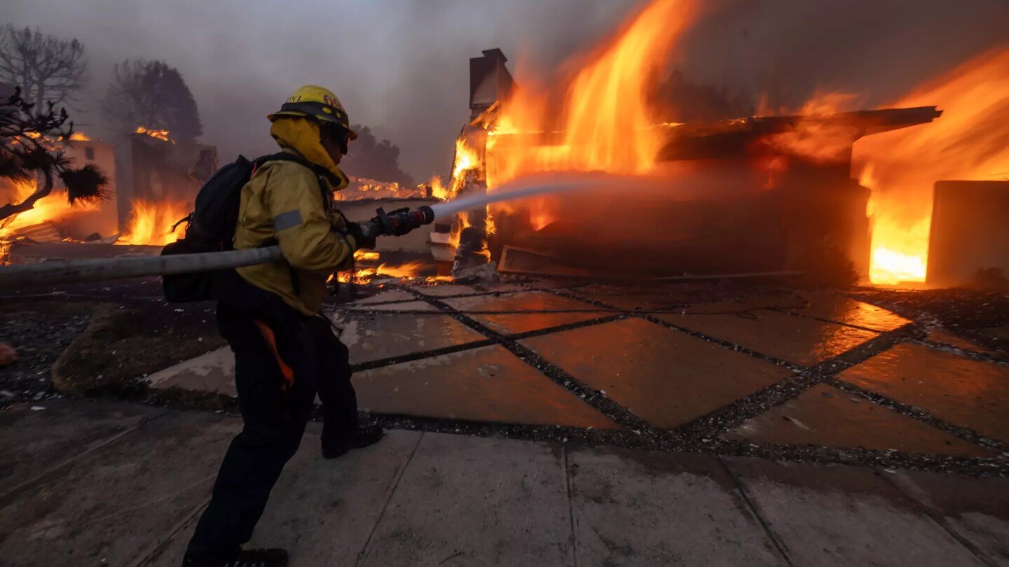 Tragic Loss: Man Battling Flames with a Hose and a Father Watchin